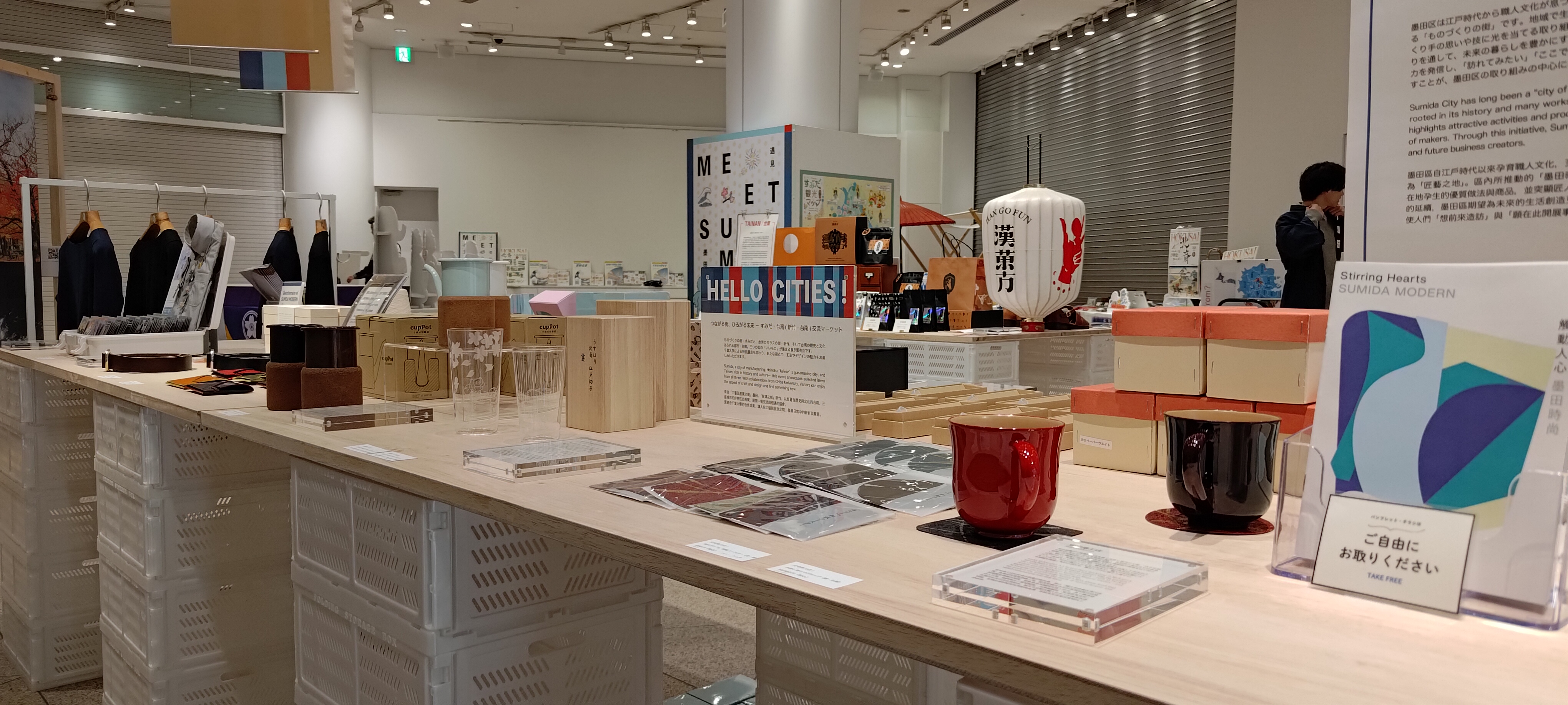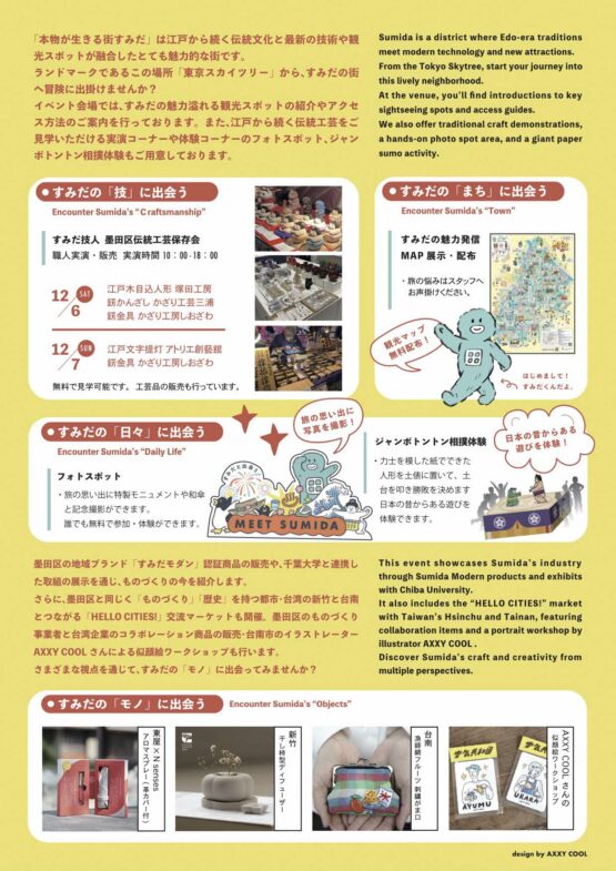 同コーナーでは、墨田区と同じく「ものづくり」「歴史」を持つ都市・台湾の新竹と台南とつながる「HELLO CITIES!」交流マーケットも開催。墨田区のものづくり事業者と台湾企業のコラボレーション商品の販売・台南のイラストレーターaxxy coolさんによる似顔絵ワークショップも行われます。