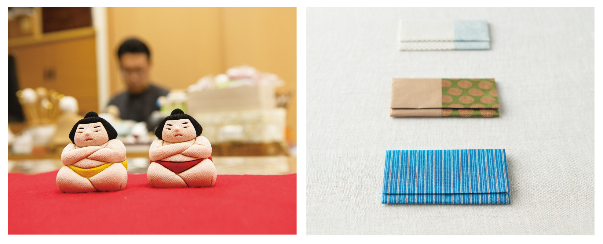“Hyogu” is a traditional papering technique for walls, folding screens, using pieces of Japanese cloths and papers. Each of the card cases made of “hagire”, pieces of “Hyogu” , leftovers conceals various “shukou” (particularly unique in Japanese traditional way) stories based on Kabuki and Sumo.