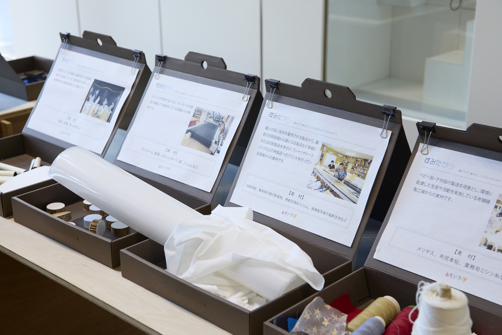 隣のコーナーには“すみだから”の入った箱も展示され、そのなかには各事業者の歩みや、優れた、ものづくりを紹介するシートが貼ってある。