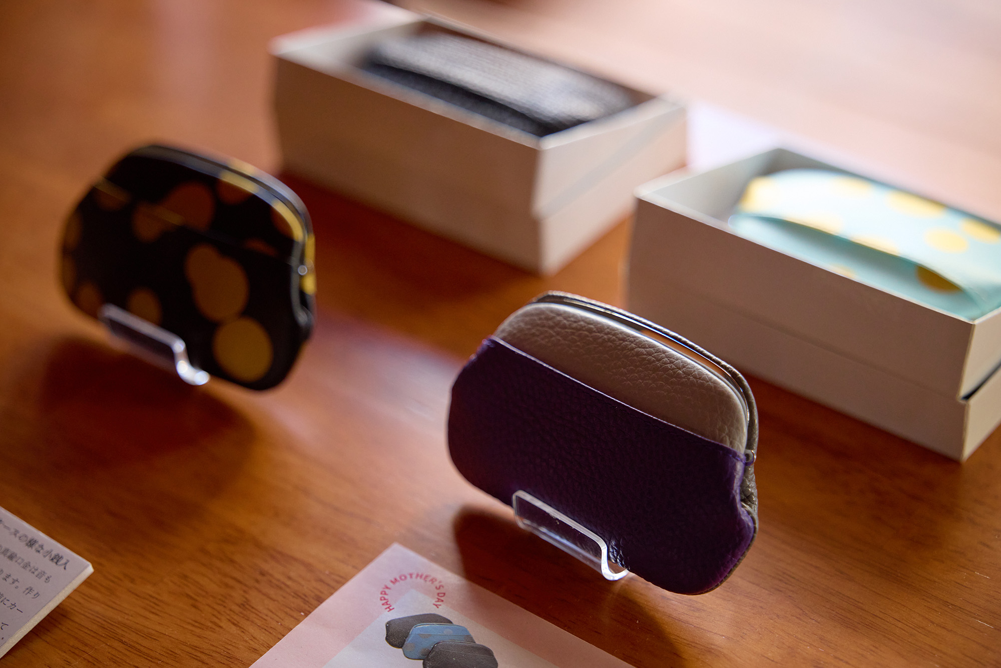 主力商品のがま口やマルチケース、長財布は、すっきりとしたフォルムもさることながら、ひとりひとりの職人がすべての工程を受け持つことで、細部にまでこだわった技の数々が詰め込まれている。