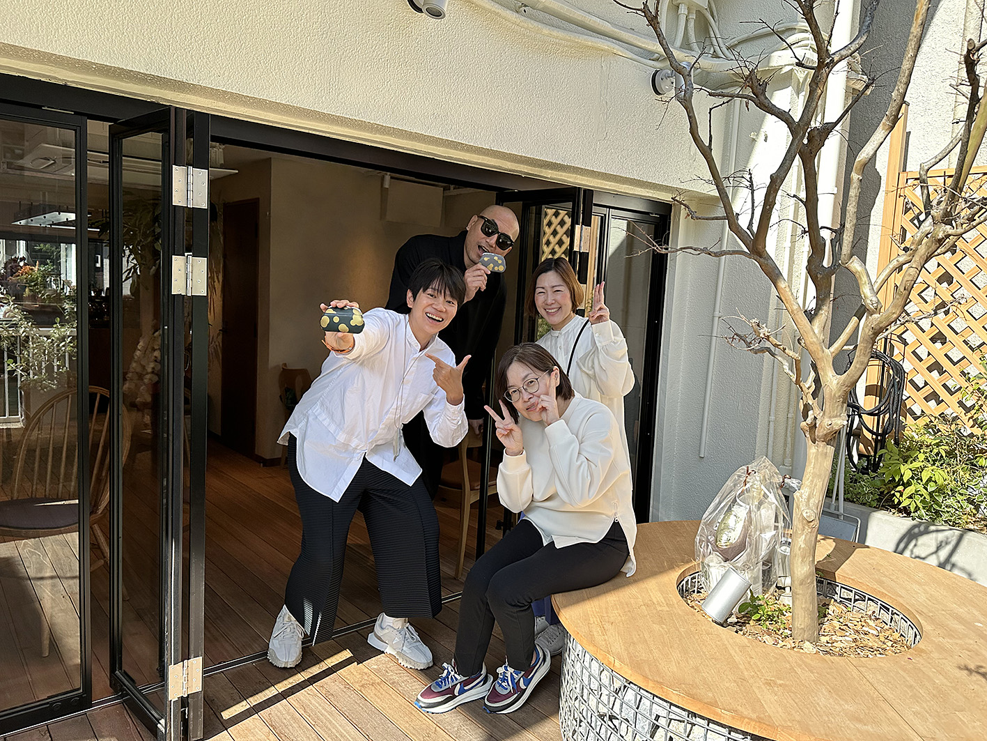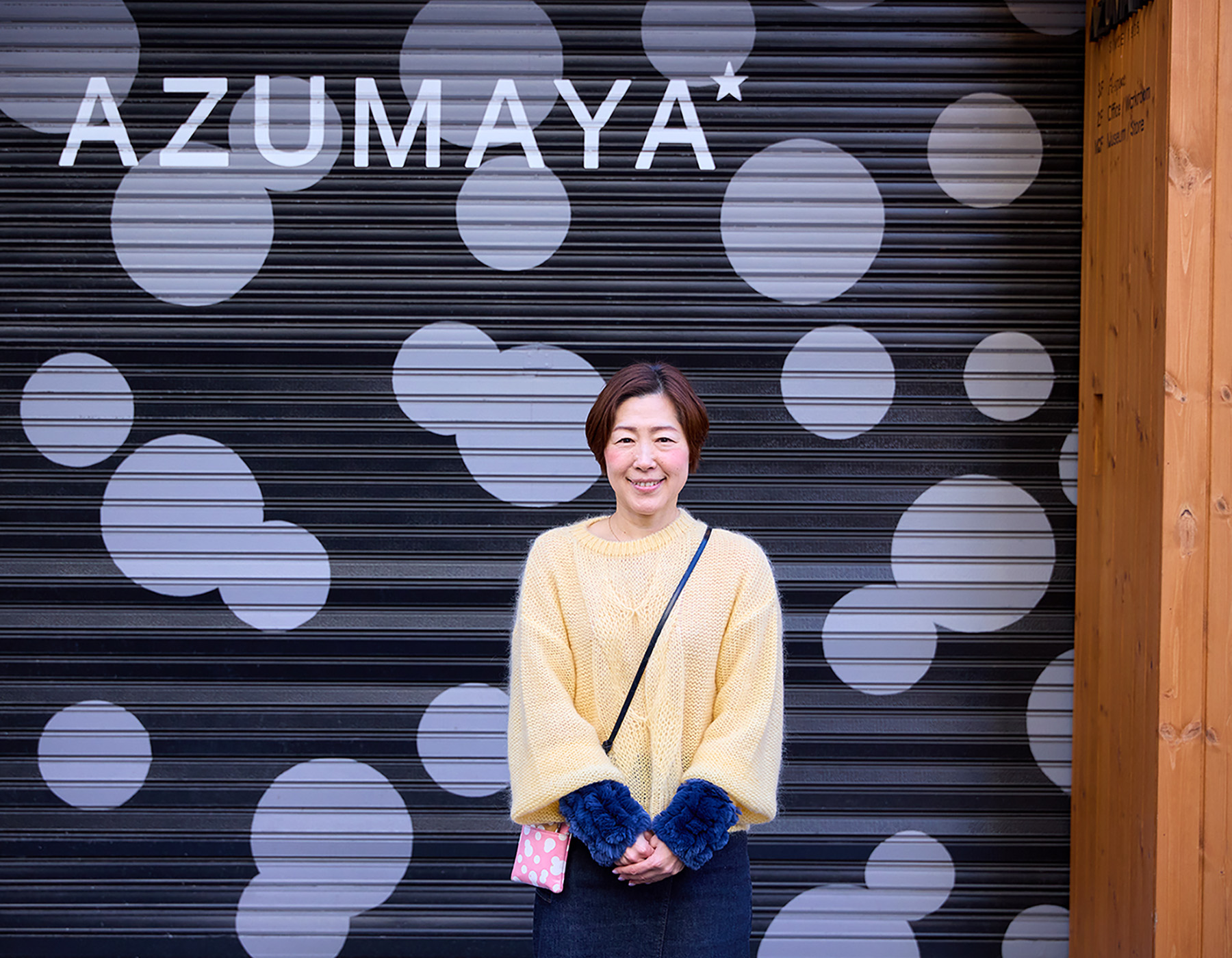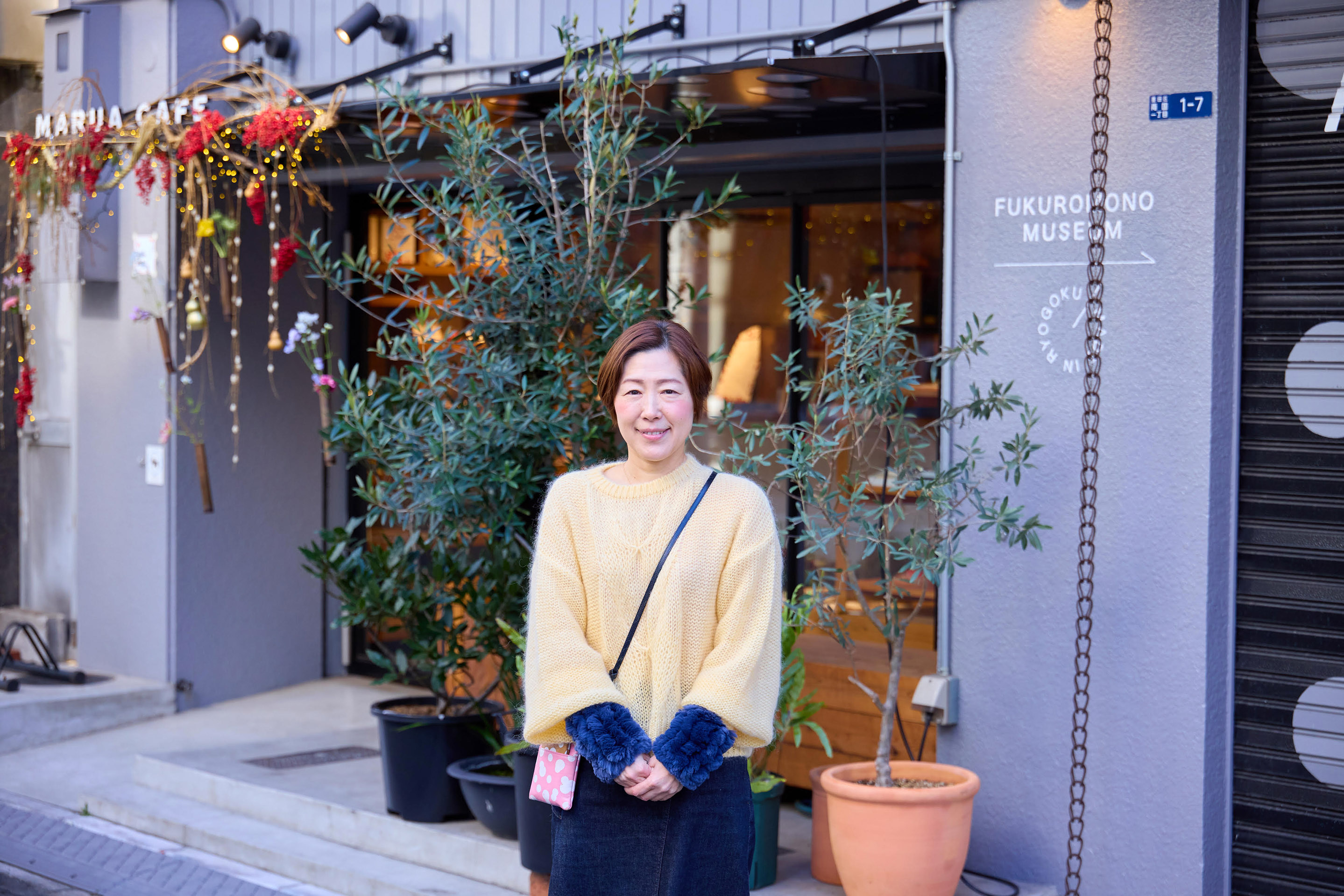 「崔さんから、『東屋の商品を気に入り、“まるあ柄”が可愛いと言ってくれているデザイナーさんがいるので今度連れて行きます』というお話がありました。皆さんが最初にお越しくださったときは、カフェで記念写真を撮りましたね。ショップのほか、当社が運営している『袋物博物館』もご覧になったと思います」。