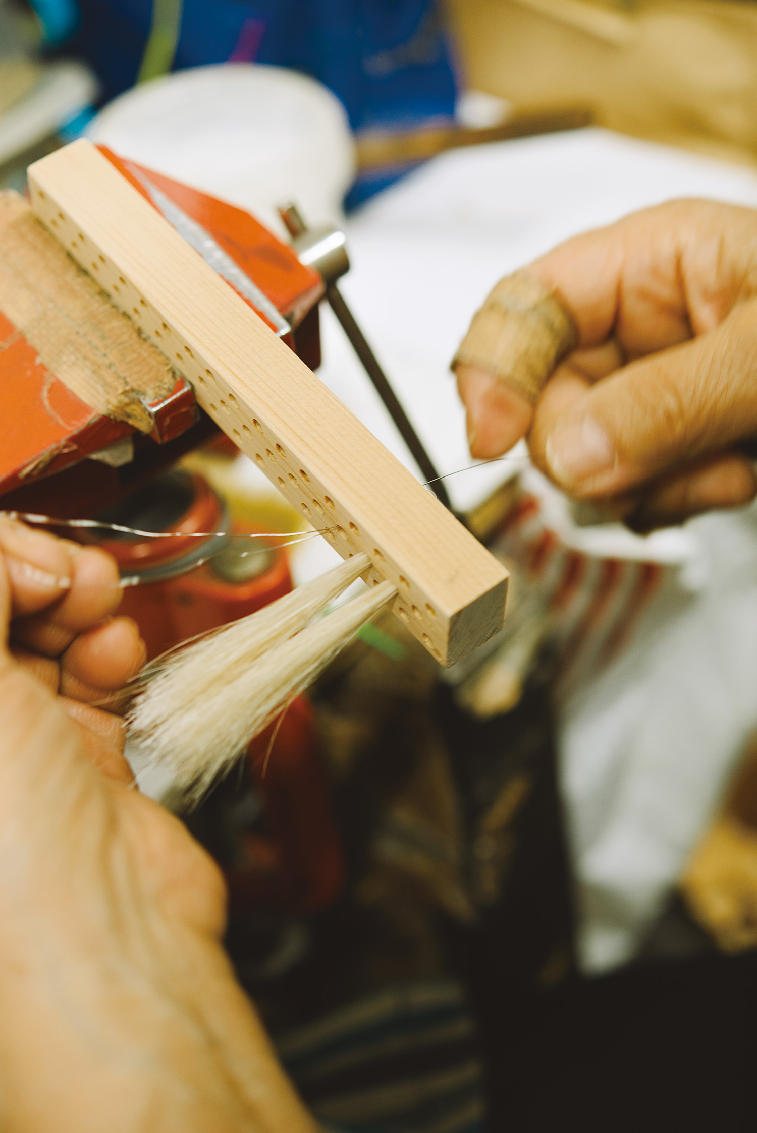 「引き線」と呼ばれるステンレスワイヤーを二つ折りにして木地の穴に通し、そこに毛を挟んで植え込んでいく。この作業を一穴ごとに繰り返す。手植えは一本の引き線でつながっているため、一穴ごとに毛を植え込む機械植えと違って毛が抜けにくく丈夫だ。