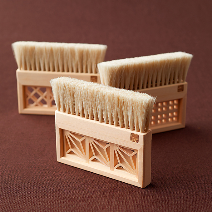 このブラシの持ち手は、欄間(日本の建築様式にみられる建具の一種で、採光・通風・装飾といった目的のために天井と鴨居との間に設けられる開口部のこと)などの建具をつくる組子職人に依頼し、縁起のよい吉祥文様を取り入れた。
