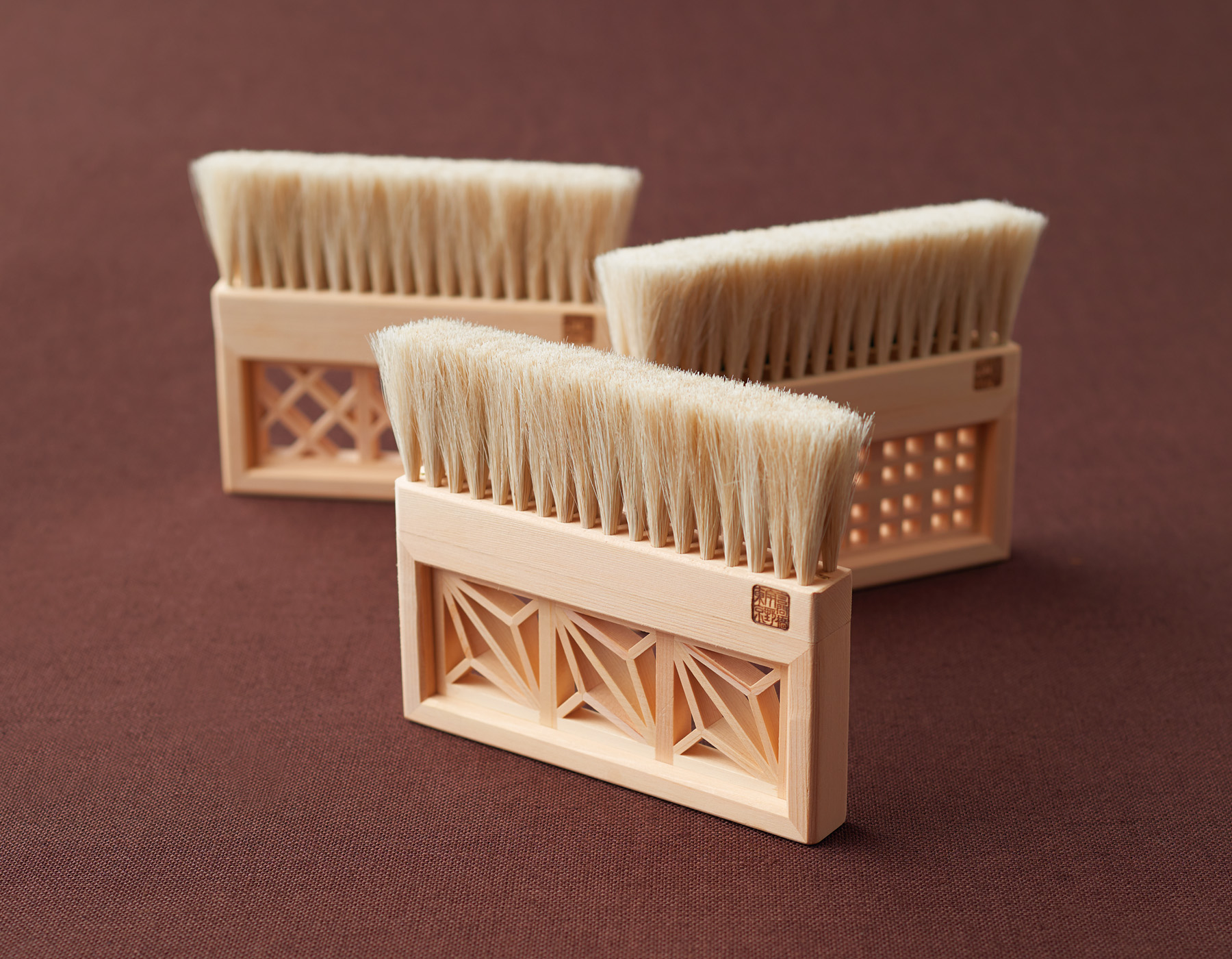 手植えブラシと組子細工、ふたつの伝統技術がひとつのブラシに集約した。組子細工の文様は、 写真の「麻の葉」「格子」「枡つなぎ」の全3種類。どれも吉祥文様――魔除けや繁栄を意味した縁起のよい柄だ。