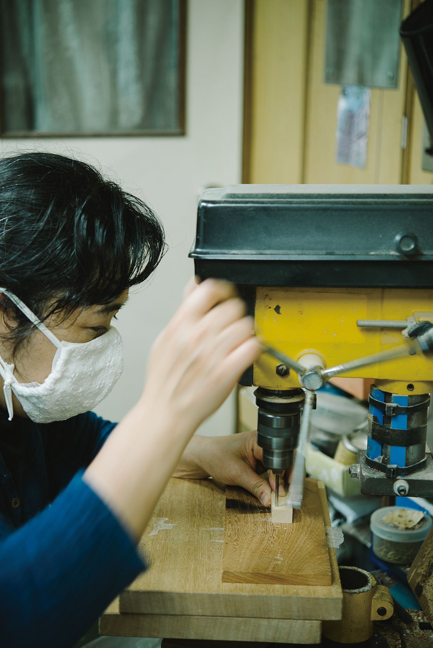 同社の刷毛、そしてブラシは、今も昔もすべて小さな工房から生まれる。母と子が背中合わせで座り、それぞれ黙々と手を動かす。取材で訪れたときは、三代目の千榮子さんが〈雅ブラシ〉の毛の植え付けを行っていた。何気なく毛束をつまみ取って植え込んでいるように見えるが、そこにも職人の鋭い感覚が生きている。