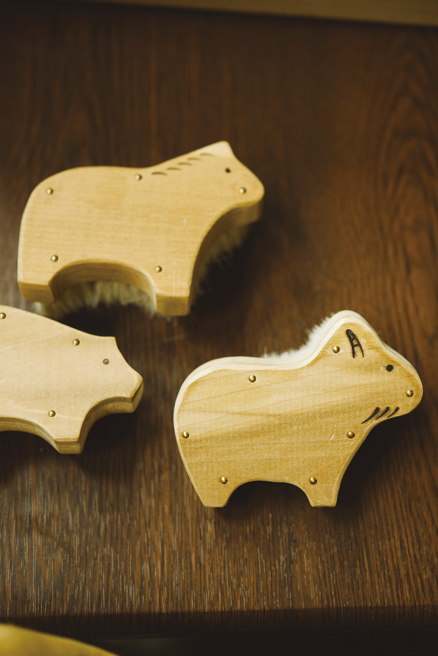 東京都のプロジェクト「東京手仕事」で、デザイナーの馬淵 晃さんとつくった〈Animal Brush - アニマルブラシ〉も自信作。馬やヤギ、豚などの天然毛を使用し、持ち手を見れば、どの動物の毛が植え込まれているか分かるようになっている。手のひらサイズの動物のフォルムが愛らしい。こちらも2016年の「すみだモダン」認証商品だ。